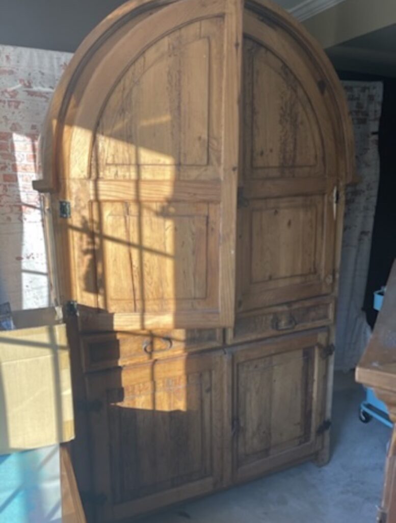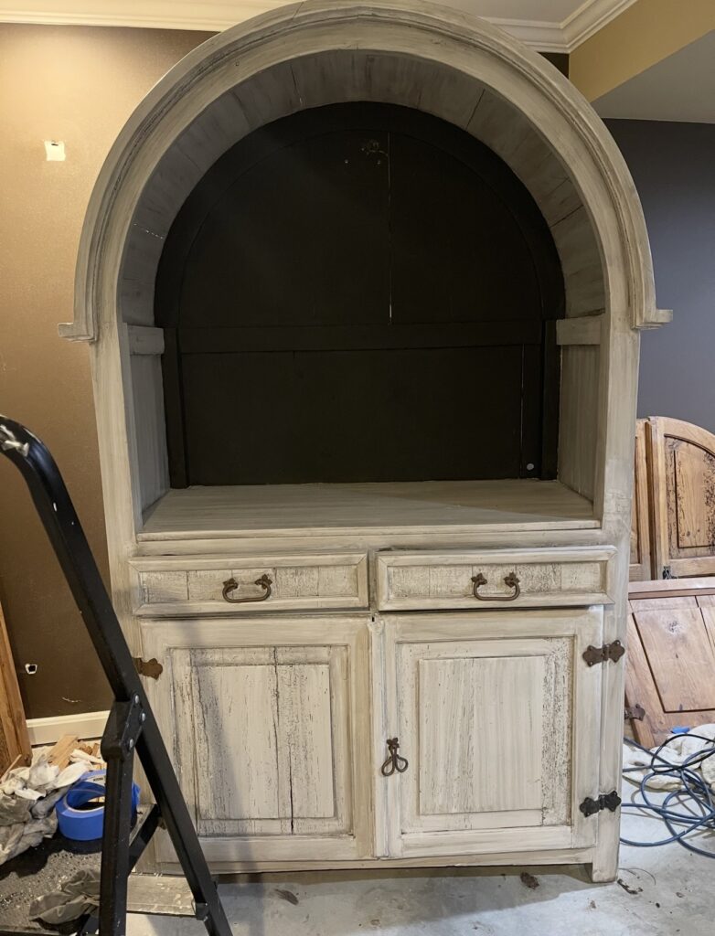 Most of these old entertainment units have removable shelves, which makes prep easy. However, the one I found didn’t! I actually had to use a sledgehammer to get them out, so just keep that in mind when you are thrifting for your piece—check those shelves first!